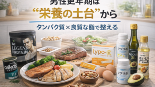 男性更年期の“対策”は、まず栄養。治療ではなく「土台作り」 男性更年期(LOH)という言葉が広まるにつれて、「サプリで何とかしたい」と考える人が増えました。でも最初に押さえたいのはここです。 栄養は“治療”ではなく、体の土台を整える基本。土...